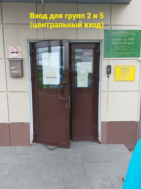 Вход в группу 2 "Проспект ромашек" и группу 5 "Бульвар Незабудок" через центральный вход (кнопки домофона "2" и "5")