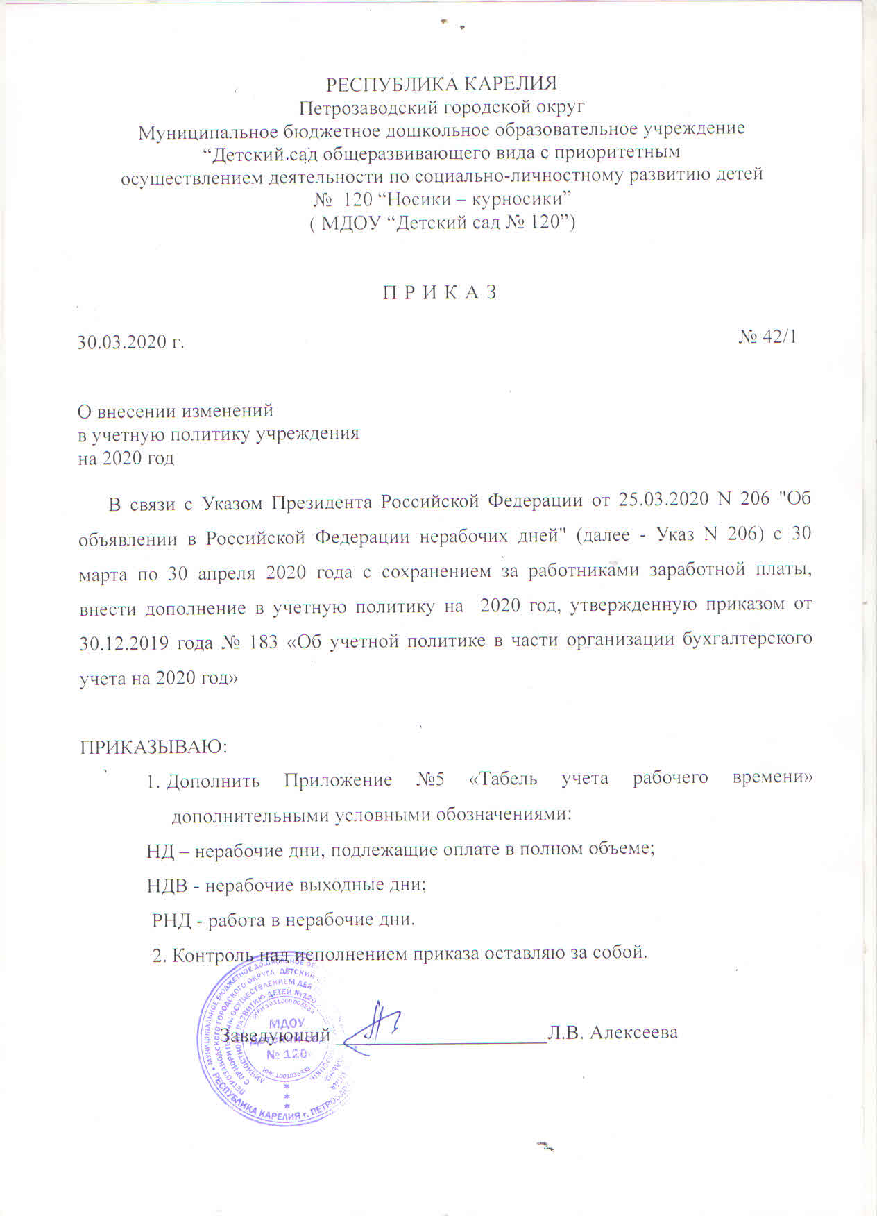 Приказ №42/1 от 30.03.2020 г. "О внесении изменений в учетную политику Учреждения на 2020 г."
